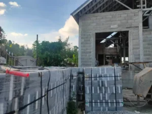 หน้างานบ้านเดี่ยว จังหวัดเชียงราย ใช้อิฐคูลบล็อกก่อผนังบ้าน รุ่นที่ใช้คือ 409 มีความหนา 9 cm. เพื่อให้ผนังมีฉนวนกันความร้อน